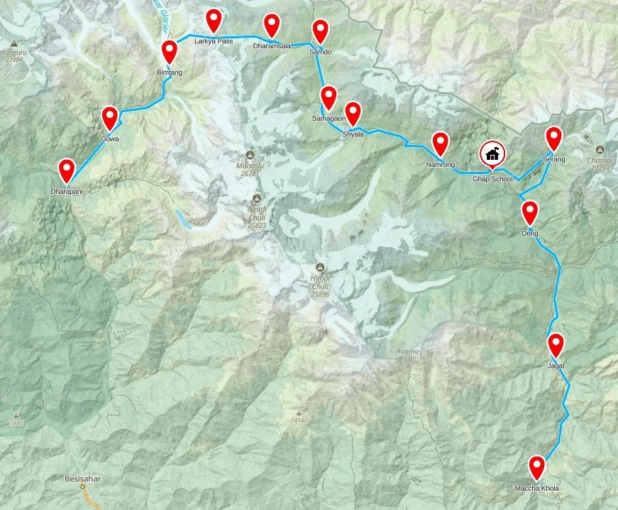 Trekking Route: Manaslu Circuit over Larkya Pass, Nepal.
